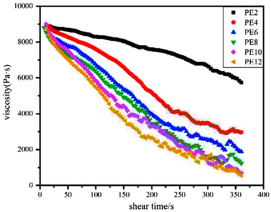 Variation in viscosity of HDPE with shear time for different end shear rates in a range of 2–12 s−1 []. Reproduced with permission: John Wiley and Sons.