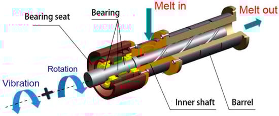 Lin et al. [] designed an eccentric rotor extruder that could generate an elongation flow to promote a good mixing of two polyolefines and reduce chain entanglement. The partially disentangled state can also be realized directly in injection molding using a vibration field [] (Figure 5). The designed machine can impose a complex shear field, i.e., rotational shear + oscillatory shear. A comparison of different shearing methods, i.e., vibratory, rotational, or combined, showed that the latter solution is the most effective in disentangling polycarbonate (PC). The same machine was used for disentangling PLA [].
