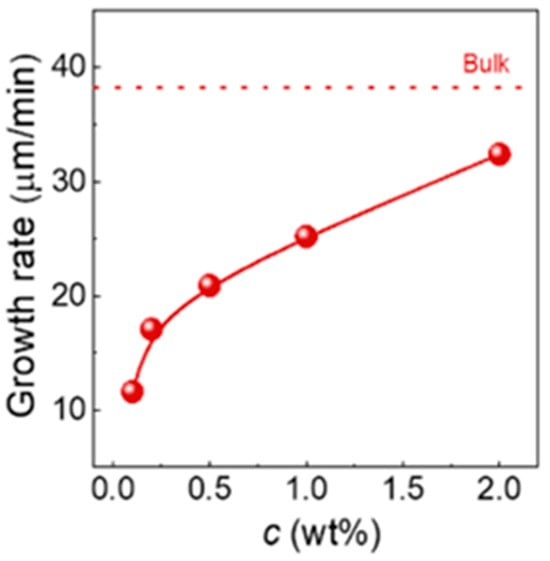 Spherulite growth rate in PB disentangled by dissolving it in p-xylene, with a concentration of c = 0.1−2 wt.%. The critical overlap concentration, c*, was estimated to be ~0.6 wt.%. The growth rate for bulk, entangled polymer is also shown []. Reproduced with permission: American Chemical Society.