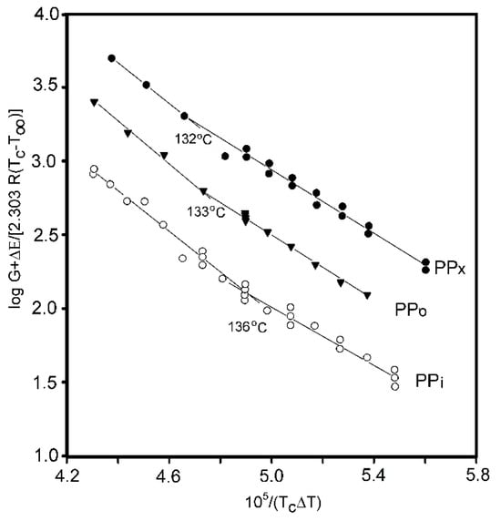A dependence log of G + ∆E/[2.3 R(Tc − T∞)] versus 1/(Tc∆T) drawn for the initial PP (PPi) and two disentangled PPs (PPo, PPx). The temperatures of the transition between crystallization regime II (on the right side) and regime III (on the left side) are also shown []. Reproduced with permission: John Wiley and Sons.