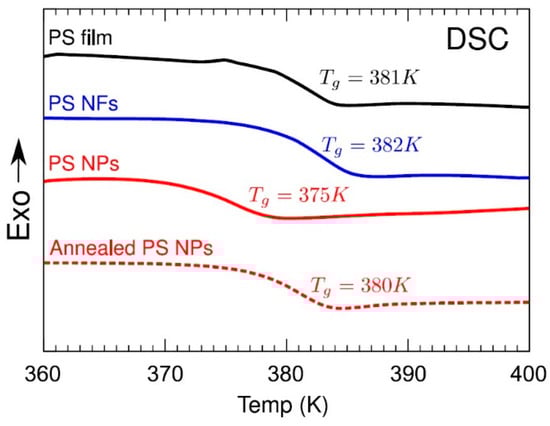 Comparison of the glass transition temperature, Tg, of entangled and disentangled PS. NPs—single-polymer chain nanoparticles, NFs—nanofibers []. Reproduced with permission: American Chemical Society.