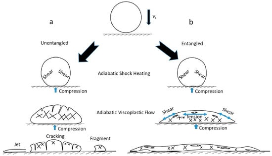 In the experiment by Shan et al. [], micro-sized spherical polystyrene projectiles made of three polymers with different Mw values (9300, 40,000, 270,000 g/mol) below and well above the Me (13,400 g/mol) were launched against a rigid substrate, causing deformation at an ultra-high strain rate (Figure 9). The bottom part of the projectiles heated up and deformed as a result of plastic flow. The upper part showed localized shear banding and brittle fracture for disentangled PS and extensive shear banding followed by crazing in the entangled samples. The absence of entanglements in PS with a molecular weight of 9300 g/mol was the reason for the non-forming of crazes and the rapid transition to fractures. Zhang et al. [] compared the mechanical properties of two commercially available UHMWPE with similar Mw values and concluded that the less entangled UHMWPE had three times more Charpy impact strength, although the tensile and flexural properties were comparable.