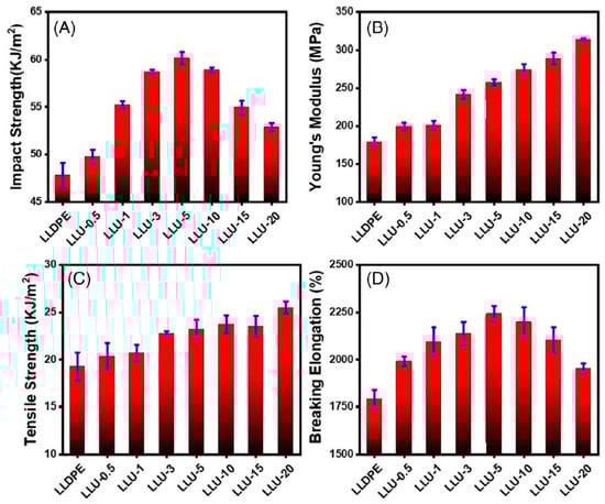 (A–D) The mechanical properties of UHMWPE/LLDPE blends. The numbers in blend names indicate the weight fraction of UHMWPE []. Reproduced with permission: John Wiley and Sons.