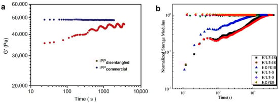 (a) Changes in the G′ modulus over time for rheological measurements, at 180 °C, of entangled and disentangled PP []. (b) Buildup of normalized storage modulus for HDPE/UHMWPE blends at 200 °C. The H/U5-18 designation means HDPE with a 5% UHMWPE addition with a shear rate of 18 s−1 []. Reproduced with permission: Elsevier.
