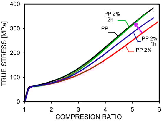 Dependence of stress on the degree of compression of samples made of entangled (PPi) and partially disentangled (PP2%) polypropylene. The effect of heating in the melt is also shown, leading to the regeneration of entanglements after 2 h []. Reproduced with permission: Elsevier.