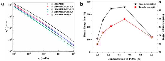 (a) Complex viscosity of UHMWPE and POSS (0.1–1 wt.%) composite measured with torque rheometer; (b) tensile properties of composite regarding the function of POSS content []. Reproduced with permission: Elsevier.