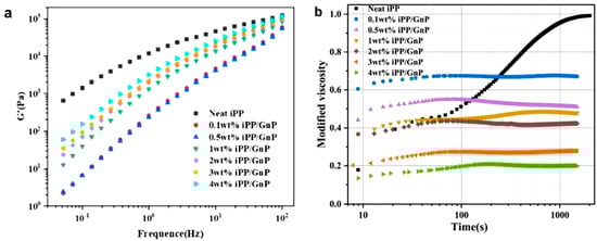 The second approach to obtaining disentangled composites is shear in melt, similar to the disentangling of homopolymers. Luo et al. [] disentangled PP containing 0.1–4 wt.% graphene nanoplatelets (Figure 14). The subject of their studies was the rheology and crystallization of the composite. The re-entanglement process was investigated at a temperature of 200 °C. The disentangled-by-shear neat PP was fully entangled; i.e., it reached initial viscosity after 2000 s. In the composites, after 100 s, the increasing viscosity of the composite reached a constant value, but at a level much lower than the value expected for the equilibrium entangled composite. According to the authors of the article, this means it maintained a disentangled state. Given their strong interaction, graphene platelets limit the movement of chains. PP in the sheared graphene composite crystallized faster compared with the non-sheared composite.
