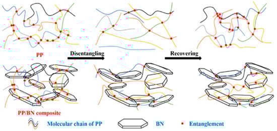 - Luo, J.; Chen, J.; Liu, M.; Min, J.; Fu, Q.; Zhang, J. Investigating the Influence of Incorporation of Boron Nitride on the Kinetics of Isotactic Polypropylene Entanglement Recovery. Ind. Eng. Chem. Res. 2021, 60, 12901–12910. [Google Scholar] [CrossRef]