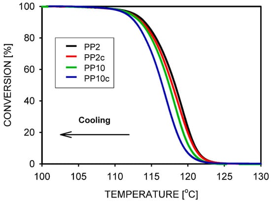 The crystallization of PP with its entanglements halved was the subject of several works by Pawlak et al. [,]. It was found that, similar to other polymers, the crystallization temperature and degree of crystallinity are higher in the disentangled polymer. The thickness of the lamellae also increases. It was shown for the first time that, in polymers under the influence of disentangling, the transition temperature between the II and III crystallization regimes decreases by 4 °C (Figure 7) []. Krajenta et al. [] studied the crystallization of PLA after limiting the density of entanglements to 20% of the initial density. The crystal growth was found to be 10% faster, and it was shown that the boundary temperatures of the crystallization regimes shift under the influence of disentangling.