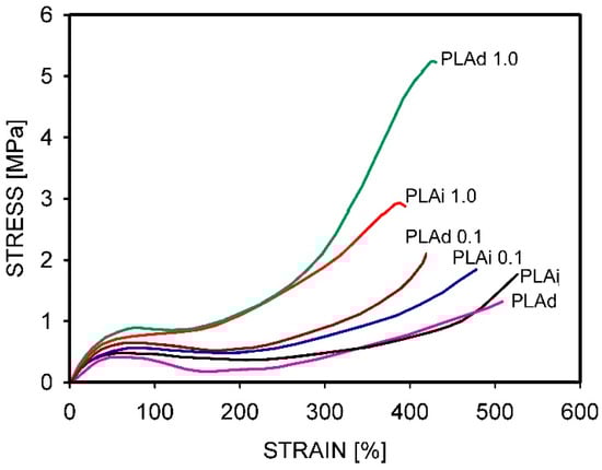 More traditional were the studies on the tensile properties of PC conducted by Wang et al. []. The novelty of their approach was the use of a modified extruder, in which the disentangling of PC was achieved by applying different shear procedures (vibration, rotation, or together). Surprisingly, no significant changes were observed between the tensile properties of disentangled and raw polymers. While examining the tensile properties of PP, Pawlak et al. [] noticed that the differences between the entangled and non-entangled polymers become visible when, instead of engineering parameters, the values of true stress and true strain were calculated. It was found that properties at yield were not changed by the reduction in entanglements. However, in the strain-hardening phase, the increase in stress was slower when the polypropylene was less entangled. Increased cavitation was observed in partially disentangled polypropylene.