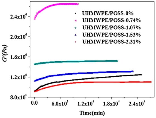 A disentangled polymer is not in a state of equilibrium, so if the movement of macromolecules is possible, it tends to reach equilibrium. The rate of the process depends on the temperature, but it is usually not fast [,]. Re-entangling can be studied by measuring changes in the storage modulus over time. The modulus after re-entangling should return to its pre-disentanglement value, and there are some observations that confirm this [].