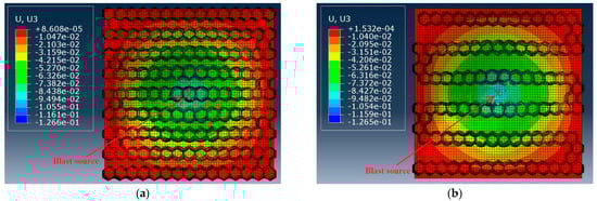 The numerical model was validated by comparing it with the results obtained from Kumar and Patel [17]. The numerical responses used for the validation were for the numerical model of 3 kg of TNT cylindrical explosives impacting a square honeycomb sandwich panel at a standoff distance of 100 mm from the center of the top plate. Figure 7 shows that the behavior of the developed numerical model is similar to the numerical model and the field experiment discussed by [17]. Moreover, the deformation shape of this research model shown in Figure 8 was compared with the model of Kumar and Patel [17] numerical results, which showed a similar deformation behavior at the center of the sandwich panel with an accuracy of around 93% for the bottom plate displacement and around 94% for the top plate displacement and an error of 13% and 17% when compared to experimental results. The difference between numerical and experimental results can be attributed to the clamping of the plate. In the numerical analysis, the plate was fixed from all sides and did not displace. As seen from the displacement profile of the experimental results for the bottom plate in Figure 7b, the whole plate was displaced vertically up from the sides. The model showed higher accuracy throughout the body of the sandwich panel, especially between 0.075 mm and 0.25 mm from the center of the sandwich panel.