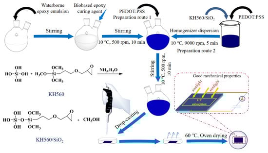 2.4. Preparation of PEDOT:PSS/Epoxy and PEDOT:PSS/Epoxy/(KH560/SiO2) Composite Coatings
