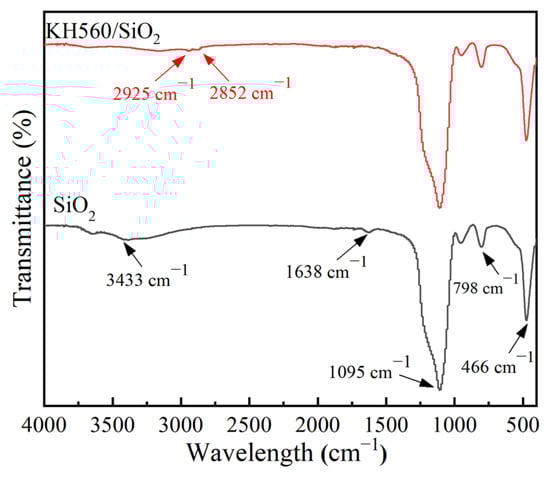 The FT-IR spectra of SiO2 and KH560/SiO2 can offer structural information, as shown in Figure 2. The FT-IR spectra of SiO2 shows typical peaks at 3433, 1638, and 1095 cm−1, which are attributed to O-H anti-symmetric stretching, H-O-H bending vibration, and Si-O-Si anti-symmetric stretching, respectively. The strong and sharp peaks at 798 and 466 cm−1 belong to the Si-O bending vibration. KH560/SiO2 shows some special peaks in contrast with the FT-IR spectra of SiO2. Characteristic peaks at 2925 and 2852 cm−1 can be observed [24], which belong to the stretching vibration peaks of -CH3 and -CH2- from the organic silane coupling agent (KH560). The results show that the introduction of KH560 to the surface of the SiO2 was successful.
