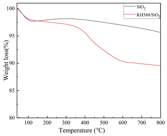 The thermal properties of SiO2 and KH560/SiO2 were measured by TGA under an N2 atmosphere and are shown in Figure 3. The results of all samples displayed a significant weight loss of about 5% from 150 °C, which can be ascribed to the decomposition of the free adsorption of water and the unstable oxygen functional groups of carbonyl and carboxyl. As the temperature increased, the decomposition of SiO2 decreased slowly and the corresponding residual rate was 96.9% at 800 °C. Moreover, the KH560/SiO2 began to show significant decomposition during the heating process. The initial thermal decomposition temperature of KH560/SiO2 was 200 °C. The silane coupling agents (KH560) contained lower heat resistance bonds of the methylene group (-CH2) and ether bond (-O-), which caused decomposition and exhibited a remarkable thermal weight loss after introduction on the surface of the SiO2. The residual rate of KH560/SiO2 was 88.5%. The introduction of KH560 bonds led to a sharp decomposition decline from the curves of KH560/SiO2 and showed the successful preparation of KH560/SiO2.