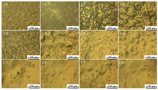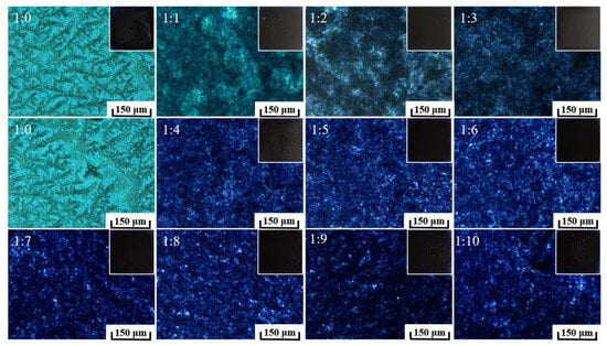 As shown in Figure 4 (inset), all the PEDOT:PSS/epoxy coatings with different P:E ratios exhibited a dark blue color and uniform appearance just like that of pristine PEDOT:PSS coating (Figure 4 inset). As shown in the microscope photos (Figure 4), it can be observed that the surface morphology of the pristine PEDOT:PSS coating exhibited a discrete dendritic distribution. The coating under an optical microscope exhibited a significant shift in color as the epoxy concentration rose. Such phenomena may originate from the aggregation trend of PEDOT:PSS macromolecular chains into large spherical composite particles in a polymer composite or the self-aggregation trend during the drying process [30], resulting in a darkening of the color. With the continuous increase in the epoxy ratios, composite coatings (P:E ratio ranging from 1:4 to 1:10) showed much denser and rougher states but without phase separation, together with gradually decreased surface electrical conductivity, as discussed below. The cause for that was that the cross-linking degree of composite polymer systems increased rapidly depending on the reaction between the epoxy resins and the amine curing agent, and the excellent compatibility between cured epoxy resin and PEDOT:PSS, but the deeply entangled distribution and encapsulated state by nonconducting epoxy resin chains will obstruct the conductive channel of PEDOT:PSS chains. To observe these composite coatings more clearly, the metallographic microscope was switched to an upper light source, so the photomicrograph of the coatings appeared yellow (Figure 5 and Figure 7).