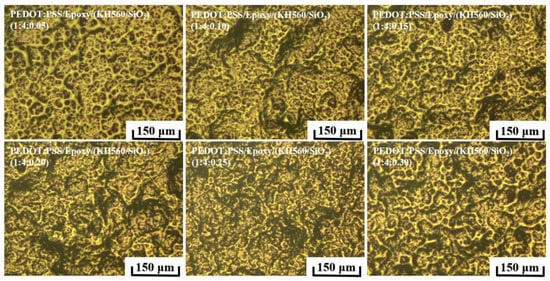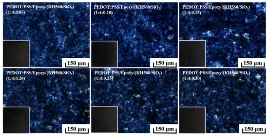 The preparation method of PEDOT:PSS/epoxy/(KH560/SiO2) coatings was the same as that of PEDOT:PSS/epoxy coatings. As shown in Figure 6 and Figure 7, all the PEDOT:PSS/epoxy/(KH560/SiO2) coatings exhibited similar, uniform, and compact morphologies, just like that of PEDOT:PSS/epoxy (P:E ratio = 1:4) in Figure 4 and Figure 5. Under a microscope, with the increase in KH560/SiO2, the coating’s color deepened in certain spots, but no sizable darkened regions were visible, demonstrating that a relatively homogeneous mixing of KH560/SiO2 with PEDOT:PSS/epoxy was accomplished.