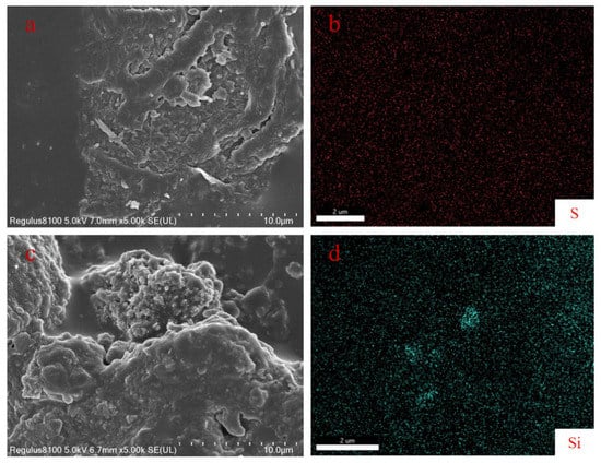 To further demonstrate that both composite systems achieve a more homogeneous mixing, the PEDOT:PSS/epoxy coating (P:E ratio = 1:4) and the PEDOT:PSS/epoxy/(KH560/SiO2) coatings (P:E:K = 1:4:0.15) were chosen for SEM structural analysis (Figure 8a,c). EDS mapping (Figure 8b,d) was then used to show the homogeneous distribution of PEDOT:PSS in epoxy for S elements and for Si elements of KH560/SiO2 in PEDOT:PSS/epoxy. The SEM picture reveals that the structural chains of the PEDOT:PSS molecules were in touch with one another in the epoxy substrate and eventually created a conductive channel, whereas KH560/SiO2 was primarily contained in the PEDOT:PSS/epoxy substrate. With the aid of EDS mapping, the homogeneous distribution of S elements in PEDOT:PSS further demonstrated the homogeneous mixing of PEDOT:PSS/epoxy; The majority of the Si elements in KH560/SiO2 were homogeneously dispersed in the PEDOT:PSS/epoxy substrate, with a small amount of Si aggregation, which confirms the relatively homogeneous mixing of the PEDOT:PSS/epoxy/(KH560/SiO2).