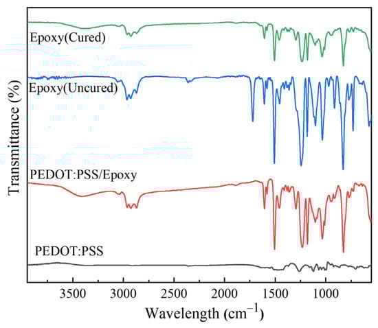 To observe the molecular structure changes in the PEDOT:PSS/epoxy system, FT-IR was used to characterize it. The absorption peak at 916 cm−1 in Figure 9 was attributed to the stretching vibration of the epoxy ring of PEDOT:PSS/epoxy just like that in uncured epoxy resin; nothing but the peak strength was weakened owing to the ring-opening reaction of the epoxy group after the addition of the biobased amine curing agent [31]. The existences of PEDOT:PSS in the PEDOT:PSS/epoxy composite coating can also be indicated due to the presence of peaks at 1636 and 1401 cm−1, which belong to the C-C and C=C stretching vibrations of the quinoidal structure of the thiophene ring. The bands that existed at 831 cm−1 were related to the C-S stretching of the thiophene ring. Moreover, the intense peak at 1035 cm−1 corresponded to the stretching vibrations of C-O-C in the ethylenedioxy group, while the peak located at 1185 cm−1 was associated with the asymmetric and symmetric vibrations of S-O in the sulfonate groups of the PSS chains [32]. As described above, the weakening of the absorption peak belonging to the epoxy ring in PEDOT:PSS/epoxy proved that the composite system has been successfully cross-linked.