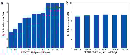 Figure 10. Bulk resistance of PEDOT:PSS/epoxy (a) and PEDOT:PSS/epoxy/(KH560/SiO2) (b) coatings.