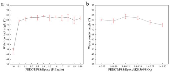 As shown in Figure 11a, the WCAs fluctuated between 79.6° and 83.8° when the P:E changed from 1:1 to 1:10, and the wetting capabilities of the composite system were somewhat diminished in comparison with the pure PEDOT:PSS and epoxy coatings. One reason is that, after the mechanical mixing and drying processes, the PEDOT:PSS/epoxy coatings showed a slightly frosted surface, resulting in improved roughness in contrast to the pure coatings of both. On the other hand, PEDOT:PSS undergoes significant aggregation with increasing epoxy, which may result in a P:E ratio with a rougher surface. This is consistent with the abovementioned morphology results shown in Figure 4 and Figure 5.