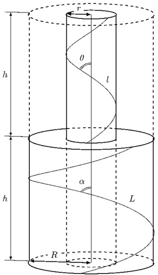 In order to generate a realistic approximation of the yarn geometry, an algorithm to model the unit cell geometry was developed. An idealized approach based on the assumptions of Hearle et al. [49] was chosen for the geometric modeling of the hybrid yarns. The yarn cross section was assumed to be circular with a constant radius along the yarn axis. One yarn comprised a multitude of filaments of finite length. Each fiber was assumed to lie on a helical path. Fiber migration was neglected, i.e., distance between fiber and yarn axis was constant. In Figure 2, an idealization of the yarn geometry with two fibers of a varying distance between fiber and yarn axis ( and ) is provided. At a constant pitch , the fiber angled to the yarn axis ( and ) and, therefore, the fiber lengths ( and ) were only dependent on the distance between fiber and yarn axis.