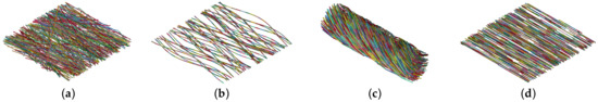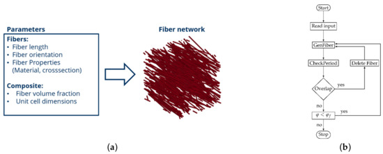 If an intersection was found, the new fiber was discarded and a new fiber was created. If no intersections could be found, the new fiber was appended to the existing fiber network. By comparing the current fiber packing fraction to an initially defined packing fraction , the described loop was provided with an exit condition. After reaching the final packing fraction, the fiber geometry, as well as information on the fiber cross section and material properties was outputted to a file for further use in simulations.