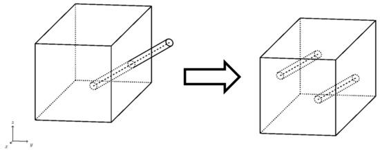 After the fiber geometry was created and a check for periodicity was carried out. If the fiber intersected the boundaries of the UC volume, it was split into two. The out-of-bounds fiber was then translated to opposite boundary (Figure 4).