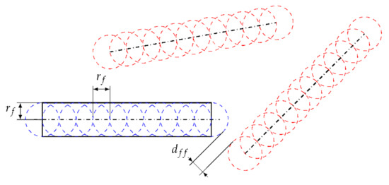 The intersection between the fibers was tested with Equation (2). The parameter described all created points of the new fiber, described the existing points. The new fiber radii were provided by , the existing radii by . An additional parameter was included to assure a minimal distance between each fiber.