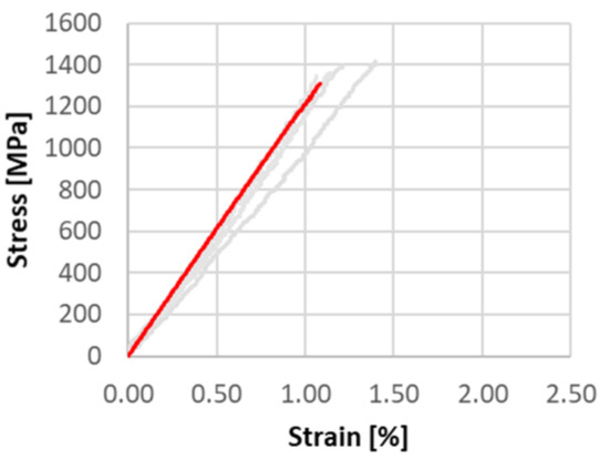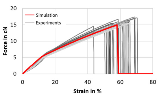 Before carrying out simulations to determine the composite properties, the fiber network was subjected to compaction in an intermediate simulative step. Virtual compaction of the fiber geometry provided a realistic fiber geometry with the final fiber volume fraction in the composite material. Because of their high aspect ratio, the filaments in the modeled yarn geometry were approximated by one-dimensional beam element chains following the approach described in Döbrich et al. [39]. Based on Döbrich’s conclusions, to model the composite behavior, a near-microscale approach was sufficient. Therefore, to limit the numerical cost of the model, the fiber cross-sections was chosen to be bigger than the real measured one. For the upper limit, the accurate representation of the local randomness of the unit cells was chosen. An overview of the selected model parameters is shown in Table 3. The material behavior of the carbon fibers was modeled by a linear elastic material model with a stress-based failure condition. The Young’s modulus was selected based on Table 1. To model the matrix component, an eight-noded hexahedral mesh was chosen. Because of its nonlinear stress-strain-behavior, an elasto-plastic material model was used. The tensile curves of the single fiber tensile tests and the simulation result are compared in Figure 7.