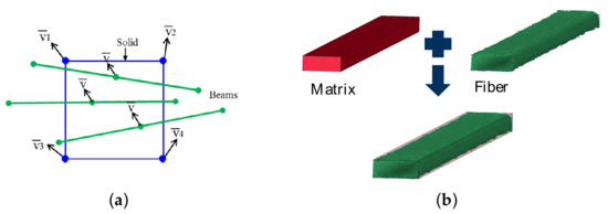 The deformed fiber geometry was used for further composite simulations. To create the composite model, the previously described DST was applied. In the DST approach, the velocities and accelerations of beam and solid elements were constrained in each direction under the assumption of an ideal fiber-matrix interface. Figure 8 shows the approach.