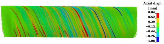 By performing the compaction simulation, the yarn geometry was transferred into a realistic composite geometry. During compaction, the fiber geometries were aligned in the axial direction, which had a positive effect on the mechanical behavior in the UD composite. Figure 10 shows the result of the compaction simulation using a yarn with 30 t/m as an example. The shift of the nodes in the axial direction indicated a rearrangement of the fibers during compaction. The compacted model geometry was further geometrically validated by comparison with micrographs (Figure 11). A good agreement with the micrograph geometry was found.