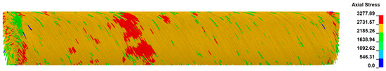 Axial fiber stresses during composite simulation of a yarn with 30 T/m (matrix elements hidden for clearity).