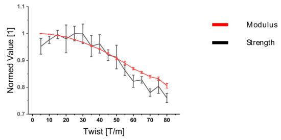 In Figure 14, the yarn twist was varied between 5 and 80 t/m. A detrimental influence of yarn twist on the composite strength and modulus is shown. Yarn twist below 20 T/m resulted in a reduction in the composite properties. This was due to the compaction step. Because of the overall better fiber orientation, the influence of local variabilities on the composite properties increased, leading to a wider variance in the composite strength.