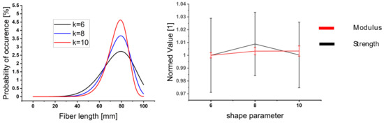 Figure 16 examines the influence of fiber length distribution on composite behavior. A variation of the shape parameter of the Weibull function for fiber length distribution influenced the standard deviation of this fiber length distribution (Figure 16 left), thus allowing fibers with lower lengths to occur. The scale parameter was changed accordingly, so that the expected value stayed constant, in accordance with the measured fiber length. The results showed no discernible influence of Weibull shape parameter on the composite properties.