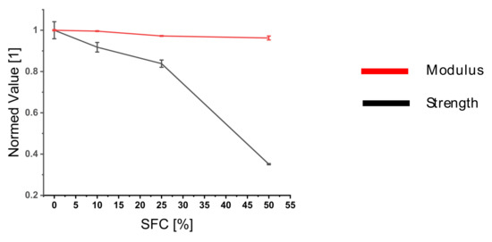 So far, the model has not considered short fibers. However, it was shown to significantly affect composite properties [10]. In Figure 17, the influence of short fiber content (SFC) on the composite properties is investigated. Because the applied method of length determination was limited for short fibers (fiber length <12.7 mm), the applied distribution was skewed for longer fiber lengths. In the model, SFC of varying volume content were included, while ensuring a constant fiber volume content in the composite. The simulation results of the composite showed a decrease in strength with higher SFC, while the influence on the composite modulus was limited.