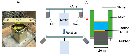 Centrifugal slurry methods were also carried out with slurry consisting of a mixture of ingredient powders and some liquids [9,11]. It is similar to centrifugal casting processes. The constituent ingredient materials are mixed in a liquid state and poured into a cylinder mold. Centrifugal force produces the gradient of the constituents in the materials due to differences in their densities and other factors when the mold is rotated. This process can be applied to fabricating ceramic/metal FGMs with a continuous gradient in accordance with predetermined distributions of specific characteristics. The advantage of using centrifugal slurry methods to centrifugal casting ones is that centrifugal slurry methods can be applied to a variety of materials without any consideration of their melting point. It was reported that such centrifugal slurry methods can be utilized for fabricating carbon nanotube (CNT) distributed aluminum FGMs using centrifugal slurry methods [9]. There has not been so much research investigating the relationship between the amount of dispersant in the solvent in the slurry and patterns of gradations of the constituents in the FGMs fabricated by centrifugal slurry methods.