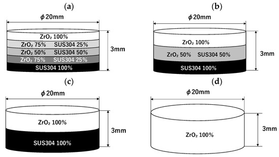Figure 1 shows a photo and schematic illustration of centrifugal slurry equipment. The mixed powder slurry was poured into the mold. The rotational speed can be changed for a variety of levels of centrifugal forces. Centrifugal operations were performed at rotating speeds of 250, 500, 750 and 1000 rpm for 1800 s. After these operations, the slurry was dried in a drying oven at 150 °C for 8 h. The dried samples were pressed at 150 kN using a cold pressing machine to obtain green bodies. The green body sample was put into a graphite mold with an inner diameter of 20 mm and a height of 50 mm, which was set in the chamber (at 20 MPa) of a discharge plasma sintering (SPS) device (CSP-KIT-02121, S.S.Alloy Co., Ltd., Japan). The samples were sintered at 1100 °C for 10 min under the uniaxial pressure of 30 MPa, followed by cooling to 800 °C in 10 min, and then cooled to RT in the SPS chamber. Disk-shaped samples with a diameter of 20 mm and thickness of 3 mm were obtained as illustrated in Figure 2. As a reference, 4 types of layered and single material samples were also consolidated, such as 5-layered material samples, 3-layered material samples, 2-layered material samples and ZrO2 (PSZ) single material samples, which are illustrated in Figure 3. The layered material samples were prepared by stacking the mixed powders of ZrO2 and SUS 304 with different compositions in the state of slurry.