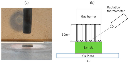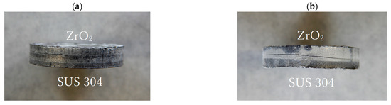 Cyclic thermal shock tests were conducted on the samples of ZrO2/SUS 304 FGMs and layered materials using the thermal shock test set-ups illustrated in Figure 6. The surfaces of ZrO2 were heated up to around 900 °C, and then the temperature was kept for 2 min, followed by cooling to room temperature (RT) in air. This heating and cooling process was repeated 30 times. After every heating and cooling process, in order to observe cracks initiating and propagating on the surfaces, the following procedure was carried out. The surfaces of ZrO2 and SUS 304 were wiped up with acetone for replica films to be attached to. The surface unevenness by cracks was transcribed onto the film. For investigating changes in mechanical properties on the surfaces of ZrO2 during the cyclic thermal shock tests, hardness and fracture toughness of the samples prior to and after cyclic thermal shock tests were measured using a Vickers hardness tester, mentioned above. Indentation fracture toughness, , was calculated by using the following equation, Equation (1) [9].
