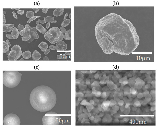 SEM images of SUS304 powders sieved through a 400 mesh (a,b) and ZrO2 powders (c,d). (a,c) are low magnification images and (b,d) are high magnification images.