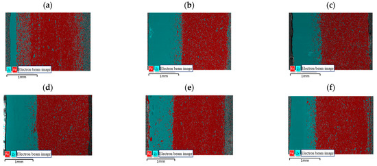 EDX element mapping results for samples with the rotating speed of 250 rpm for different amounts of PCA dispersant. (a) PCA (0%), (b) PCA (1%), (c) PCA (3%), (d) PCA (5%), (e) PCA (10%), (f) PCA (20%).