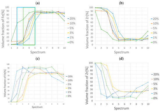 Results of element analysis for the samples with rotating speeds of 250 rpm and 1000 rpm with different amounts of dispersant of PCA. (a) for volume fraction (%) of Fe, and (b) for volume fraction (%) of Zr for 250 rpm. (c) for volume fraction (%) of Fe, and (d) for volume fraction (%) of Zr for 1000 rpm.