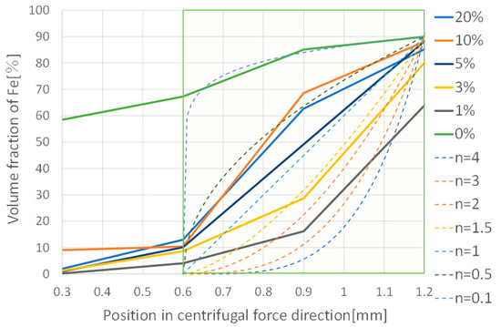 Compositional gradient distributions for the FGMs with the rotating speed of 250 rpm with fitting curves expressed by Equation (2). The experimental data for PCA from 0 to 20% and fitting curves from n = 0.1 to 4 are shown. The part surrounded by a green line corresponds to the functionally graded layer.