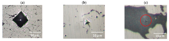 Optical microscope images of residual indentation impressions for micro Vickers hardness (a) and nanoindentation (b,c). (a) is impression for Micro Vickers hardness, (b) is impression for Nanoindentation (in SUS304 phase), (c) is impression for Nanoindentation (in ZrO2 phase).