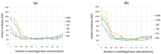 Vickers hardness in cross sections in centrifugal force directions in the samples with rotation speeds of 250 rpm (a) and 1000 rpm (b) for a variety of amounts of PCA.