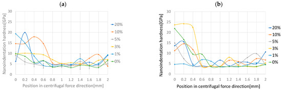 Nanoindentation hardness in cross sections in centrifugal directions in the samples with the rotation speeds of 250 rpm (a) and 1000 rpm (b) for a variety of amounts of PCA.