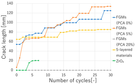 Regarding the effect of compositional gradient patterns formed by centrifugal slurry methods on capability of resistance to cyclic thermal shock loadings, the FGMs with a rotating speed of 250 rpm were investigated. As shown in Figure 10, by changing the amount of PCA (1~20%) in a slurry, it is possible to control the compositional gradient patterns from ceramic (Zr)-rich gradient patterns (n = 0.5) to metal (Fe)-rich gradient patterns (n = 3). In a previous study, it was reported about cyclic thermal shock resistance of ZrO2-Ti FGMs, ZrO2-Ni FGMs and others that the FGMs with metal-rich compositional gradient patterns showed higher resistance to cyclic thermal shock loadings compared to the FGMs with linear or ceramic-rich gradient patterns [4,25]. As already mentioned, during cyclic thermal shock tests, creep of ZrO2 at high temperatures on heating or keeping high temperatures highly affects thermal stress states in the ZrO2 surface layer at the subsequent cooling stage, that is, high in-plane tensile stresses generated in the ZrO2-rich surface layers [4,25,31]. Although only crack propagations on the surface layers were examined in the current study, it may also be important to probe the crack propagating into the materials, which directly leads to the fracture.
