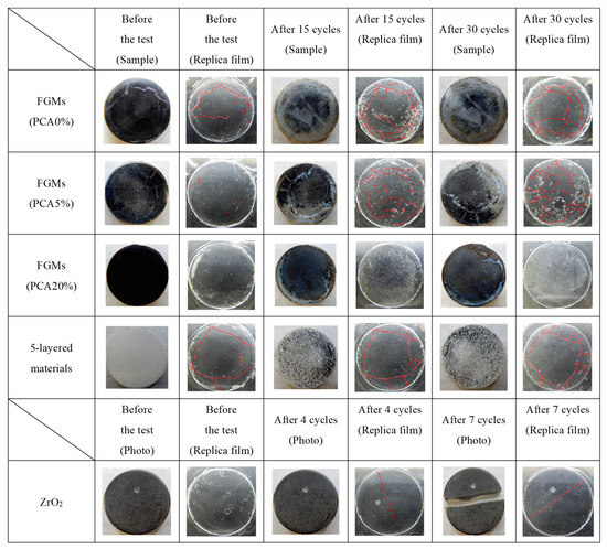Here, consider the thermal stress states in the materials during the cyclic thermal shock tests. On the ZrO2-rich surfaces heated, the ZrO2 surface layer thermally expanded, leading to the in-plane compressive stresses generated in the ZrO2 surface layer. The in-plane compressive stresses can make the ZrO2 layer undertake compressive creep. Just at the start of cooling, the states of in-plane stresses in the ZrO2 surface layer change from compressive to tensile. The maximum in-plane tensile stresses in the ZrO2 surface layer can be reached just after the start of cooling [4]. Such tensile stresses in the ZrO2 surface layer cause fracture of the ZrO2 surface layer. For ZrO2 single-layer materials, such tensile stresses can make cracks generate from the heated surface and propagate into the materials, which leads to fracture of the whole materials splitting in half as shown in Figure 15. It is considered that compositional gradients in the FGMs and 5-layered materials can contribute to reduce such thermal stresses compared to ZrO2 single-layer materials. Regarding distributions of cracks propagating on ZrO2-rich surfaces as shown in Figure 15, for FGMs with PCA (0% and 5%) and 5-layerd materials, cracks generated in the outer portions during the fabrication processes and at the beginning of the cyclic thermal shocks. With an increase in the number of thermal shock cycles, network-like cracks were developed on ZrO2-rich surfaces of the FGMs with PCA (0% and 5%). Regarding the SUS304-rich surfaces, there was no crack generated from the fabrication to the (final) 30th thermal shock for all the samples of FGMs with PCA (0%, 5% and 20%) and 5-layered materials.