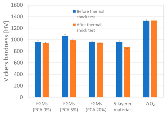 Next, the changes in mechanical properties of the samples during cyclic thermal shock tests are focused on. Figure 17 shows Vickers hardness on the ZrO2-rich surfaces of the FGMs with PCA (0%, 5% and 20%), 5-layered materials and ZrO2 single-layer materials before and after cyclic thermal shock tests. It is seen that the hardness of the samples after cyclic thermal shock tests was slightly lower than those of the samples before the cyclic thermal shock tests. This is because in-plane tensile stresses were generated and remain in the ZrO2-rich surface layer after cooling processes in cyclic thermal shock tests, which can make the apparent hardness lower. In addition, the hardness of the ZrO2-rich surfaces of the FGMs with PCA (0%, 5% and 20%) and 5-layered materials was lower than that of ZrO2 samples. It is considered that the ZrO2-rich surfaces of the FGMs with PCA (0%, 5% and 20%) and 5-layered materials may contain SUS304 in the ZrO2-rich surface layer.