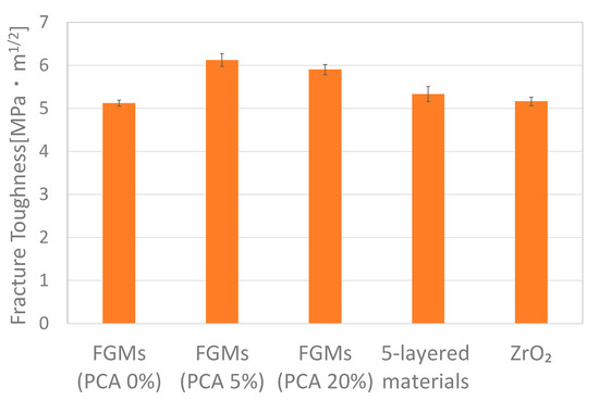Figure 19 shows fracture toughness of the samples of FGMs with PCA (0%, 5% and 20%), 5-layered materials and ZrO2 materials after the cyclic thermal shock tests, which is calculated from the length of cracks as shown in Figure 18 using Equation (1). It can be seen that FGMs with PCA (5% and 20%) and 5-layered materials showed higher fracture toughness than ZrO2 single phase materials. It is considered that compositional gradient in the FGMs and 5-layered materials can contribute to the reduction of thermal stresses causing stress-induced transformation during the cyclic thermal shock tests, which leads to keeping the initial high fracture toughness of the ZrO2-rich surface layer prior to cyclic thermal shock tests.